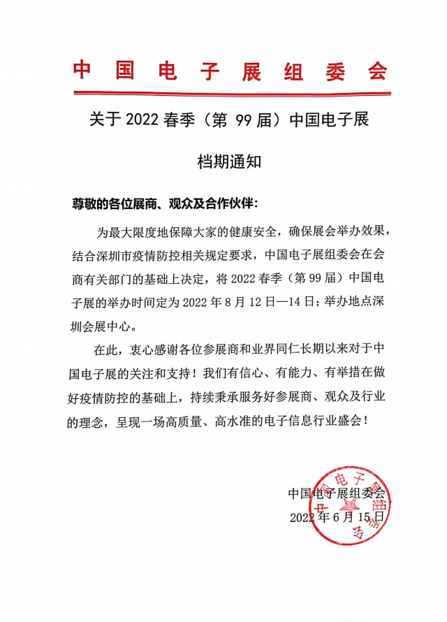 為最大限度地保障大家的健康安全,確保展會舉辦效果,結合深圳市疫情防控相關規定要求,中國電子展組委會在會商有關部門的基礎上決定,將2022春季(第99 屆)中國電子展的舉辦時間定為2022年8月12日一14日;舉辦地點深圳會展中心。在此,衷心感謝各位參展商和業界同仁長期以來對于中國電子展的關注和支持!我們有信心、有能力、有舉措在做好疫情防控的基礎上,持續秉承服務好參展商、觀眾及行業的理念,呈現一場高質量、高水準的電子信息行業盛會!