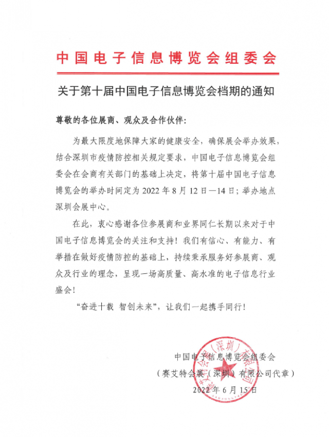 為最大限度地保障大家的健康安全,確保展會舉辦效果,結合深圳市疫情防控相關規定要求,中國電子信息博覽會組委會在會商有關部門的基礎上決定,將第十屆中國電子信息博覽會的舉辦時間定為2022年8月12日一14日;舉辦地點深圳會展中心。在此,衷心感謝各位參展商和業界同仁長期以來對于中國電子信息博覽會的關注和支持!我們有信心、有能力、有舉措在做好疫情防控的基礎上,持續秉承服務好參展商、觀眾及行業的理念,呈現一場高質量、高水準的電子信息行業盛會!