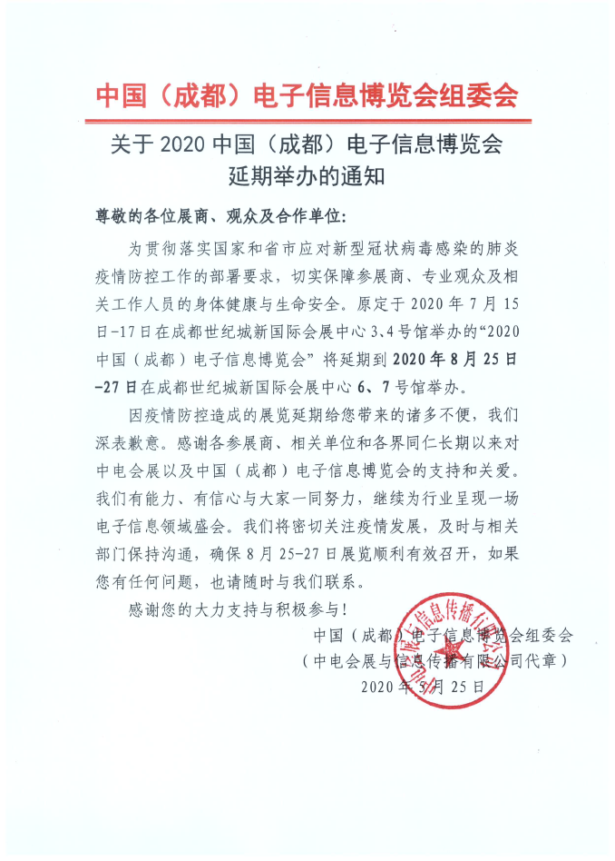 為貫徹落實(shí)國(guó)家和省市應(yīng)對(duì)新型冠狀病毒感染的肺炎疫情防控工作的部署要求,切實(shí)保障參展商、專業(yè)觀眾及相關(guān)工作人員的身體健康與生命安全。原定于2020年7月15日-17日在成都世紀(jì)城新國(guó)際會(huì)展中心3、4號(hào)館舉辦的“2020中國(guó)(成都)電子信息博覽會(huì)”將延期到2020年8月25日-27日在成都世紀(jì)城新國(guó)際會(huì)展中心6、7號(hào)館舉辦。